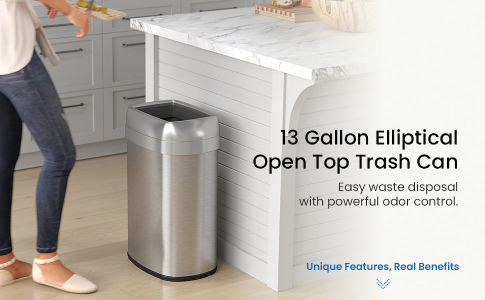 The 13 Gallon Stainless Steel Open Top Trash Can combines sleek design with practical functionality, making it an excellent choice for busy homes, offices, or commercial spaces. Its slim, elliptical design fits easily against walls or in tight areas, while the wide-open top allows quick and hassle-free disposal.