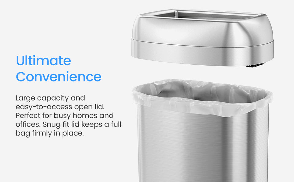 - Wide open top for fast and easy disposal, perfect for high-traffic areas such as kitchens, offices, and public spaces