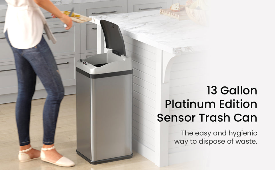 The 13 Gallon Platinum Edition Stainless Steel Sensor Kitchen Trash Can offers the best in convenience and hygiene for your home. With its 100% touch-free sensor lid and AbsorbX Odor Control System, this automatic trash can ensures hands-free operation while effectively controlling odors.