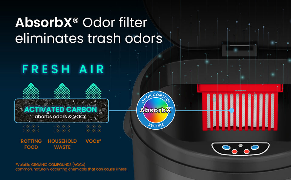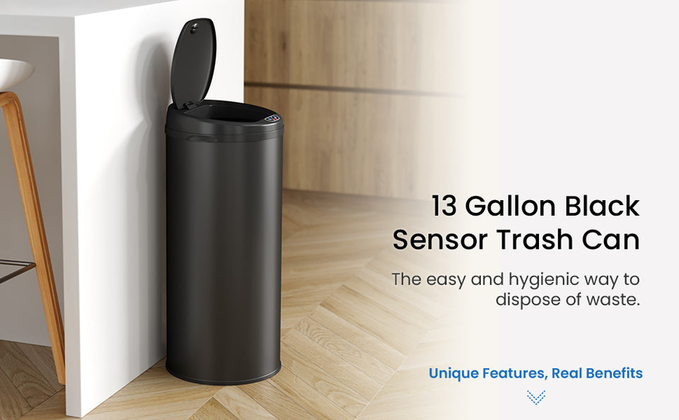 The 13 Gallon / 49 Liter Black Stainless Steel Sensor Kitchen Trash Can is the ideal automatic trash can for a clean, modern kitchen. This touchless trash can features an automated sensor lid for hygienic, hands-free operation, making it the perfect choice for those who prioritize convenience and cleanliness. Equipped with the AbsorbX Odor Control System, it helps maintain a fresh environment by eliminating unpleasant odors.