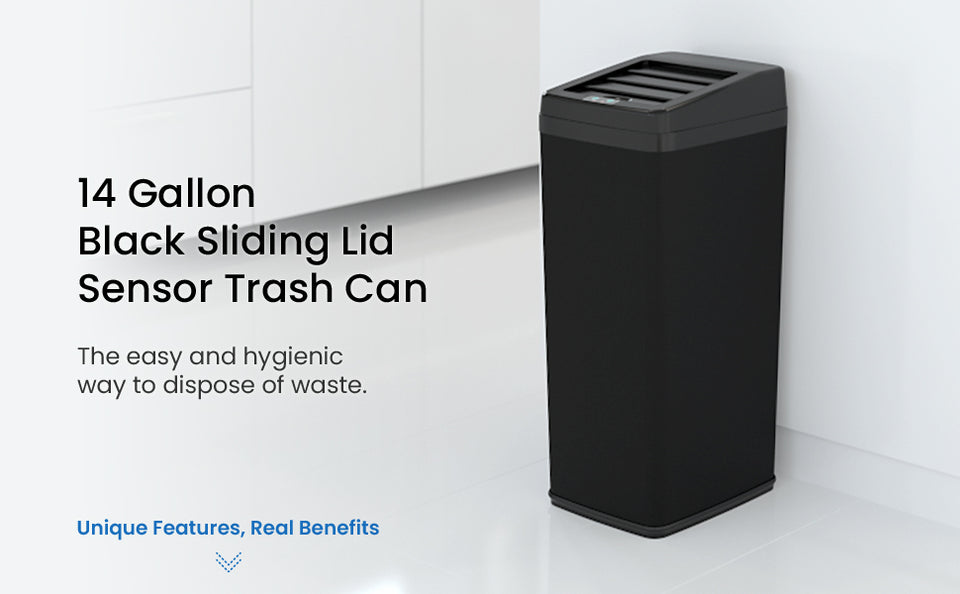 The 14 Gallon Black Stainless Steel Sliding Lid Sensor Kitchen Trash Can combines advanced technology and sleek design, making it the best kitchen trash can for any home. This touchless trash can features a space-saving retracting lid that opens automatically with a sensor, ensuring a hygienic and hands-free experience. Equipped with the AbsorbX Odor Control System, it helps keep your home smelling fresh while offering a large 14-gallon capacity.