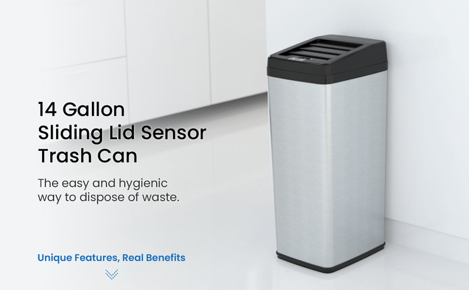 The 14 Gallon Stainless Steel Sliding Lid Sensor Kitchen Trash Can is designed for both convenience and style, offering a touchless trash can solution for your kitchen or bathroom. This large-capacity automatic trash can features a space-saving retracting lid and the AbsorbX Odor Control System, ensuring a fresh environment and a clean appearance.