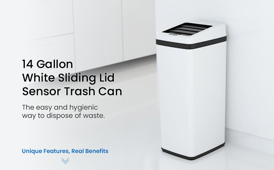 The 14 Gallon White Stainless Steel Sliding Lid Sensor Trash Can offers a sleek, modern solution for keeping your home clean and fresh. This touchless trash can features a space-saving retracting lid and an advanced AbsorbX Odor Control System, making it ideal for use as a kitchen trash bin, bathroom trash can, or outdoor garbage can.