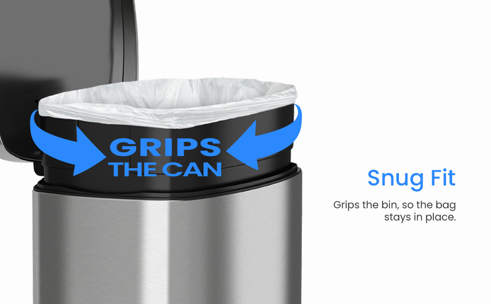 These premium quality trash bags are designed to fit this can perfectly so they don't slip, and they stay completely hidden with the use of included retainer ring. Extra strong plastic construction to prevent leaks and tears. Satisfaction guaranteed!