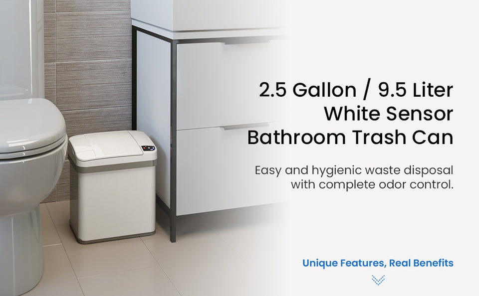 The 2.5 Gallon / 9.5 Liter White Stainless Steel Sensor Bathroom Trash Can is the perfect solution for any bathroom. Featuring a touchless trash can design, this sleek stainless steel trash can operates with a convenient sensor, ensuring hygienic, hands-free lid operation. The AbsorbX Odor Filter and Lemon Fragrance Cartridge provide complete odor control, leaving your bathroom smelling fresh at all times.