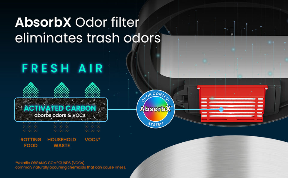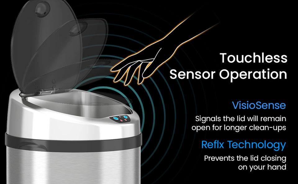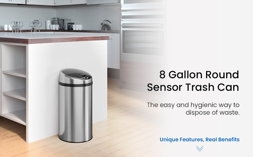 The 8 Gallon / 30 Liter Stainless Steel Round Sensor Kitchen Trash Can offers a hygienic, touchless trash can solution with a 100% automated sensor lid and AbsorbX Odor Control System. Perfect for modern kitchens, bathrooms, and offices, this automatic trash can ensures convenience and cleanliness.