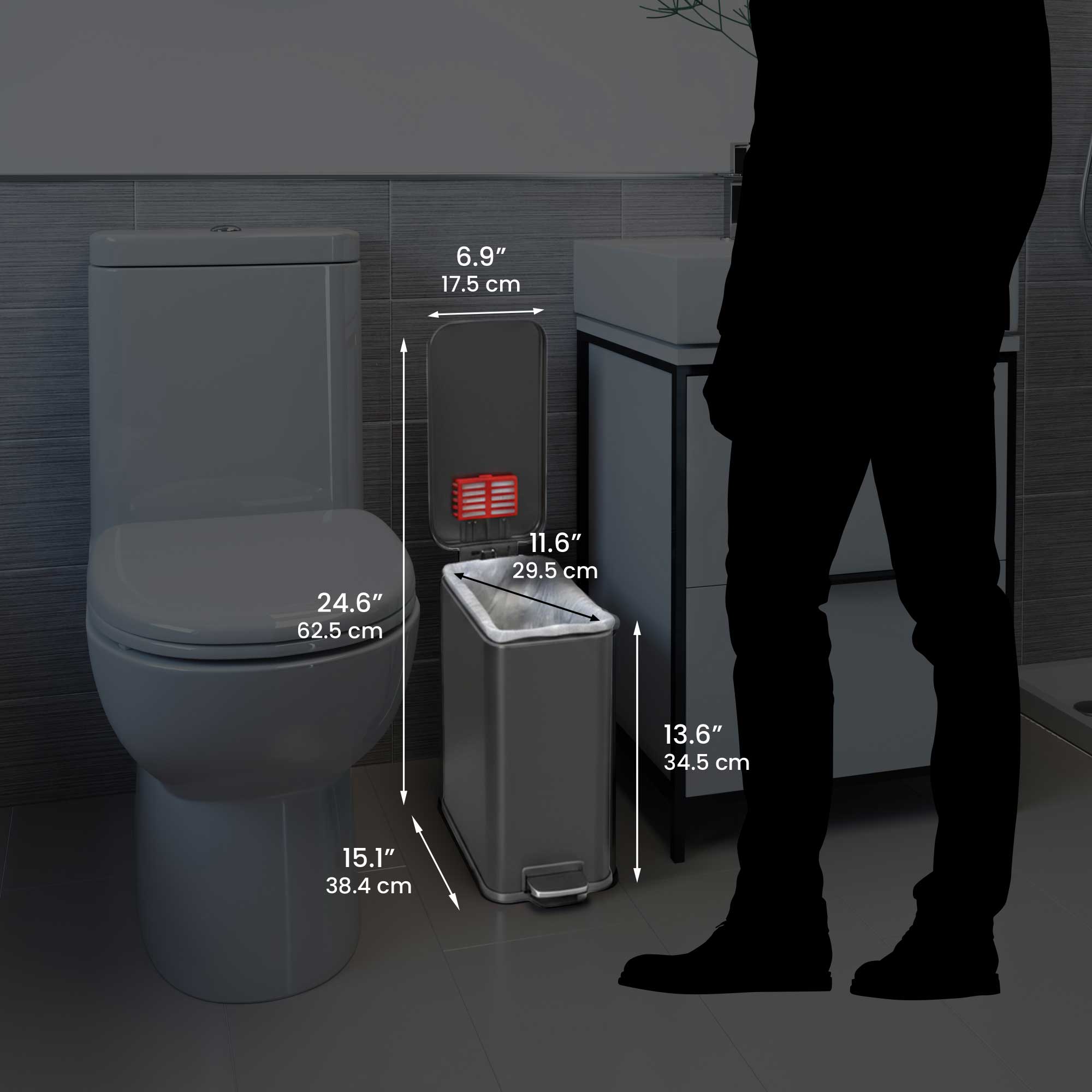Upgrade your bathroom or workspace with the 3 Gallon / 11.4 Liter SoftStep Gunmetal Gray Stainless Steel Slim Step Pedal Bathroom Trash Can — the ideal compact waste solution for small spaces. Designed for both style and function, this sleek trash can features a slim, space-saving profile, smooth pedal operation, and a soft-close lid for quiet, hands-free convenience. The included AbsorbX® natural carbon odor filter keeps your area fresh and odor-free, while the fingerprint-proof stainless steel finish complements any modern décor.