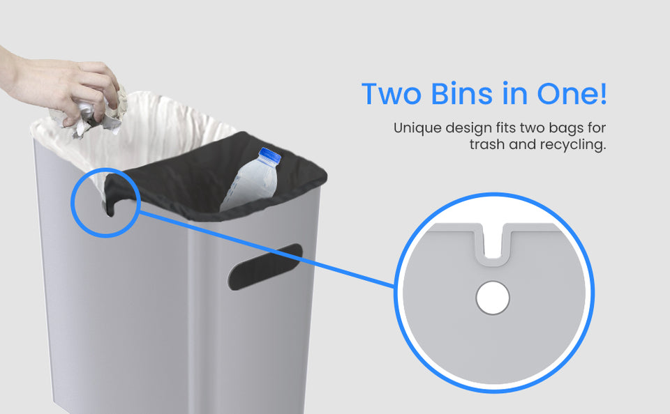 • Unique split design allows two bags to be placed in - one for trash, the other for recyclables