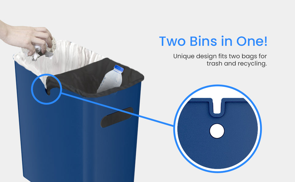 • Unique split design allows two bags to be placed in - one for trash, the other for recyclables