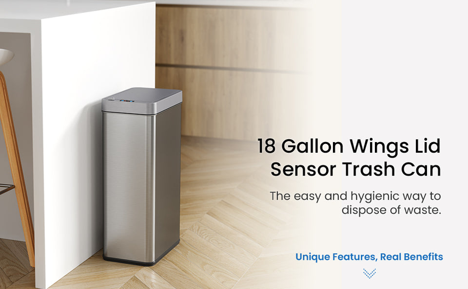 The 18 Gallon Stainless Steel Wings Lid Sensor Kitchen Trash Can offers a modern, hygienic solution for managing waste in your kitchen or home. The low-clearance wings open design fits perfectly under kitchen countertops or tables, saving space while maintaining functionality.