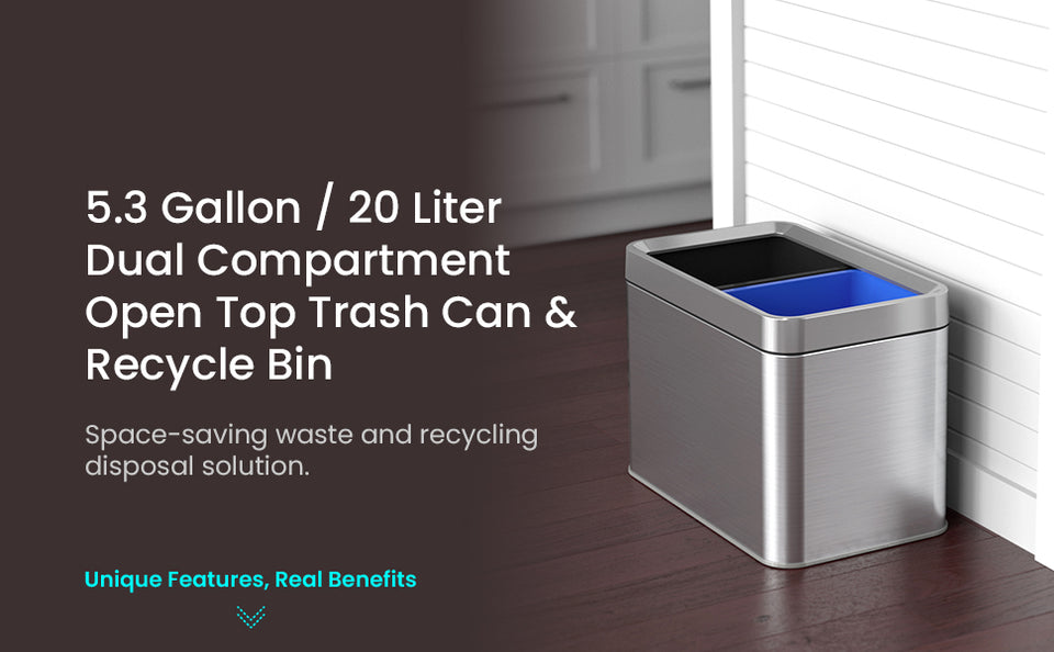 Make waste separation easy with the 5.3 Gallon / 20 Liter Dual Compartment Stainless Steel Open Top Kitchen Trash Can & Recycle Bin Combo. Designed for efficiency, this kitchen trash can allows quick and convenient sorting of trash and recyclables into separate, color-coded buckets. The fingerprint-proof stainless steel body ensures it stays looking sleek, while the ABS plastic lid offers durability.