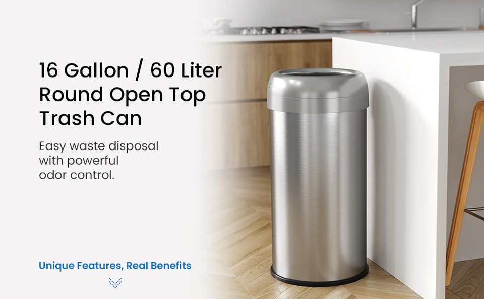 The 16 Gallon / 60 Liter Stainless Steel Round Open Top Kitchen Trash Can is a perfect solution for busy homes, offices, and commercial spaces. Designed to handle large trash volumes, this automatic trash can features dual AbsorbX odor filters to keep trash odors in check, while its fingerprint-proof stainless steel body ensures a sleek and easy-to-maintain finish.