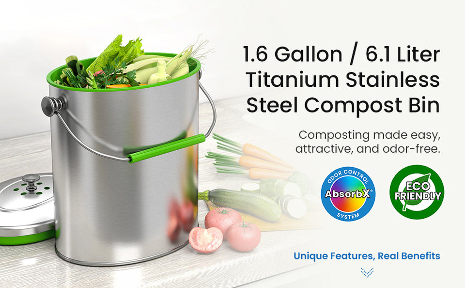 Upgrade your kitchen with our 1.6 Gallon Touchless Stainless Steel Compost Bin! This sleek, compact bin combines functionality and style to make composting clean and odor-free.