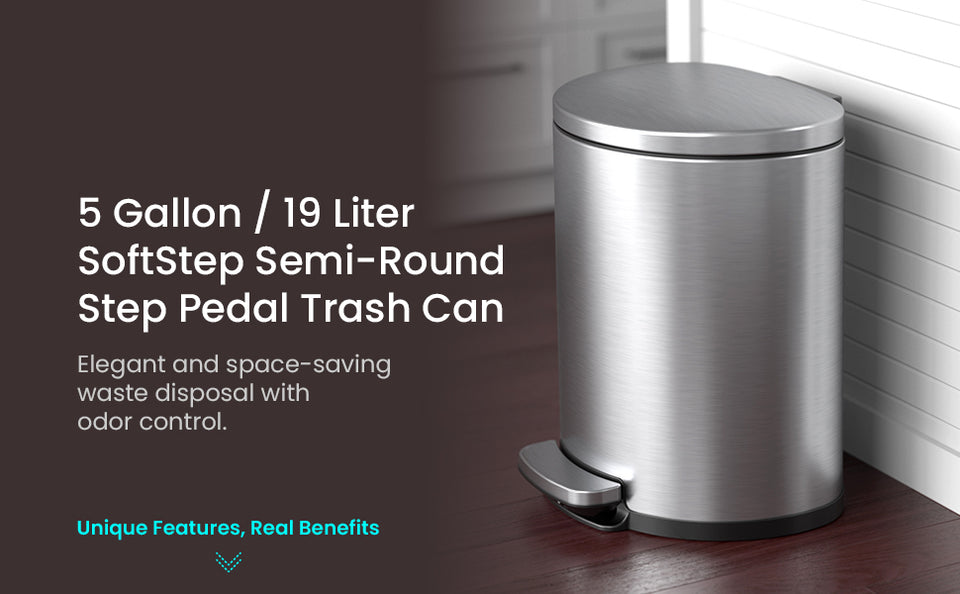 This 5 Gallon / 19 Liter SoftStep Stainless Steel Semi-Round Step Pedal Kitchen Trash Can combines style, convenience, and durability for your kitchen or bathroom. The sleek, space-saving semi-round design is perfect for tight spaces and provides a modern touch. Featuring smooth, easy pedal operation and a silent, gentle lid close, this touchless trash can minimizes mess and odors.