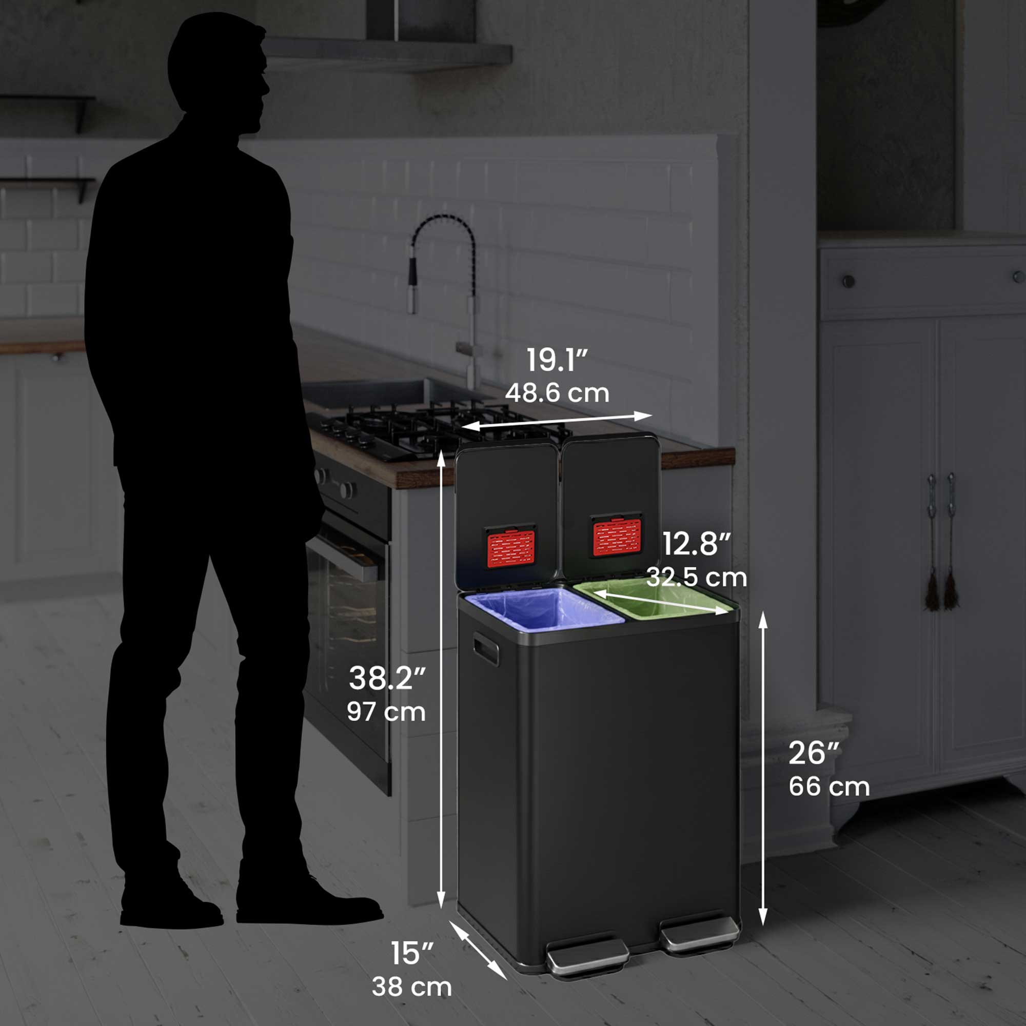 - Dual Compartment Design — Two separate sections make it easy to sort trash and recyclables in one sleek unit.