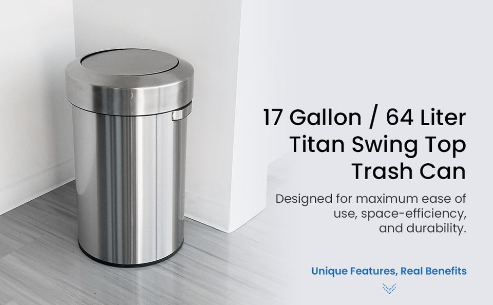 The 17 Gallon / 64 Liter Titan Stainless Steel Swing Open Top Trash Can offers style and functionality, making it perfect for the kitchen, office, garage, pantry, or business. Designed with a swinging lid, it keeps trash out of sight while containing odors within the trash bin.