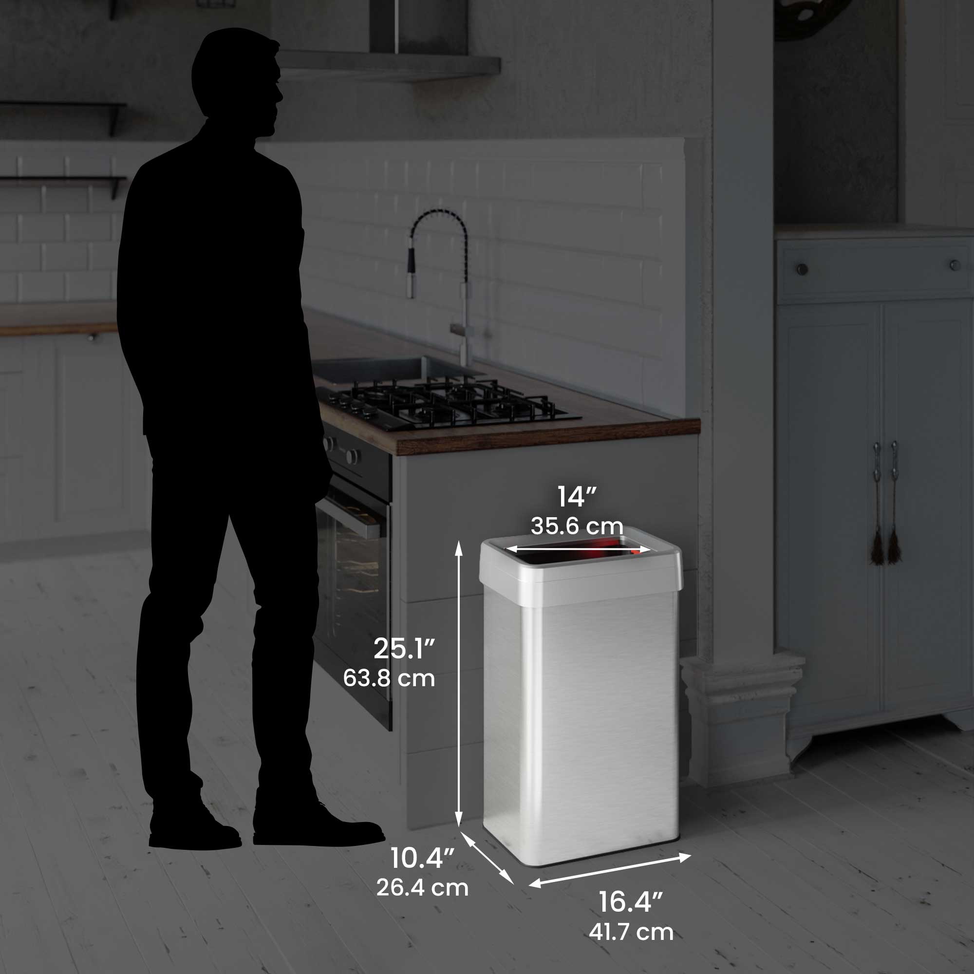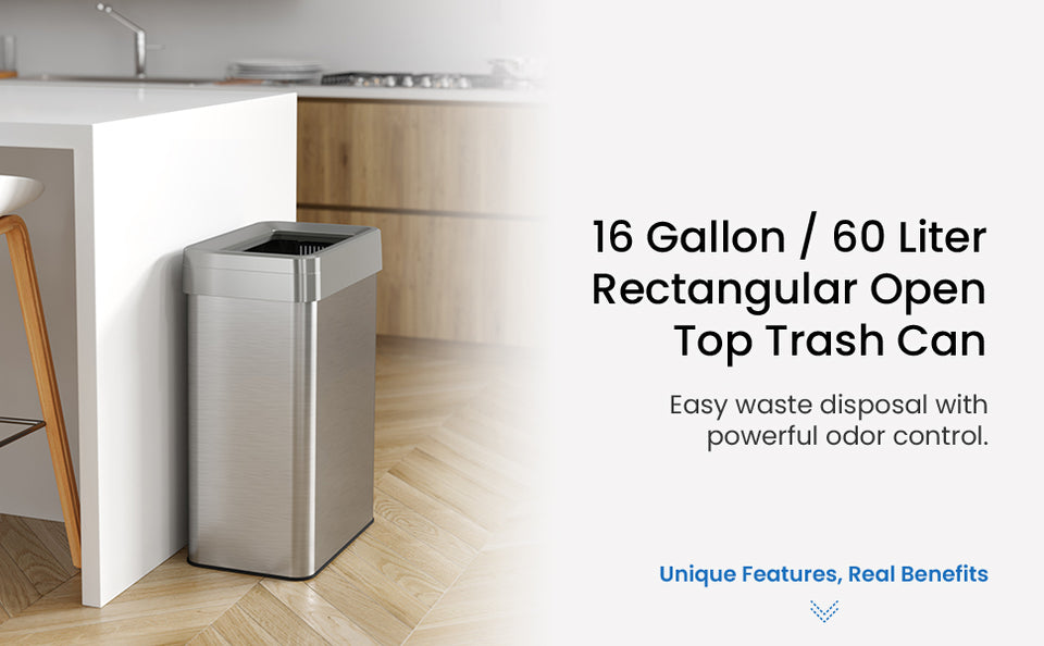 61 Liter / 16 Gallon Rectangular Open Top Stainless Steel Kitchen Trash Can with Dual AbsorbX Odor Filters