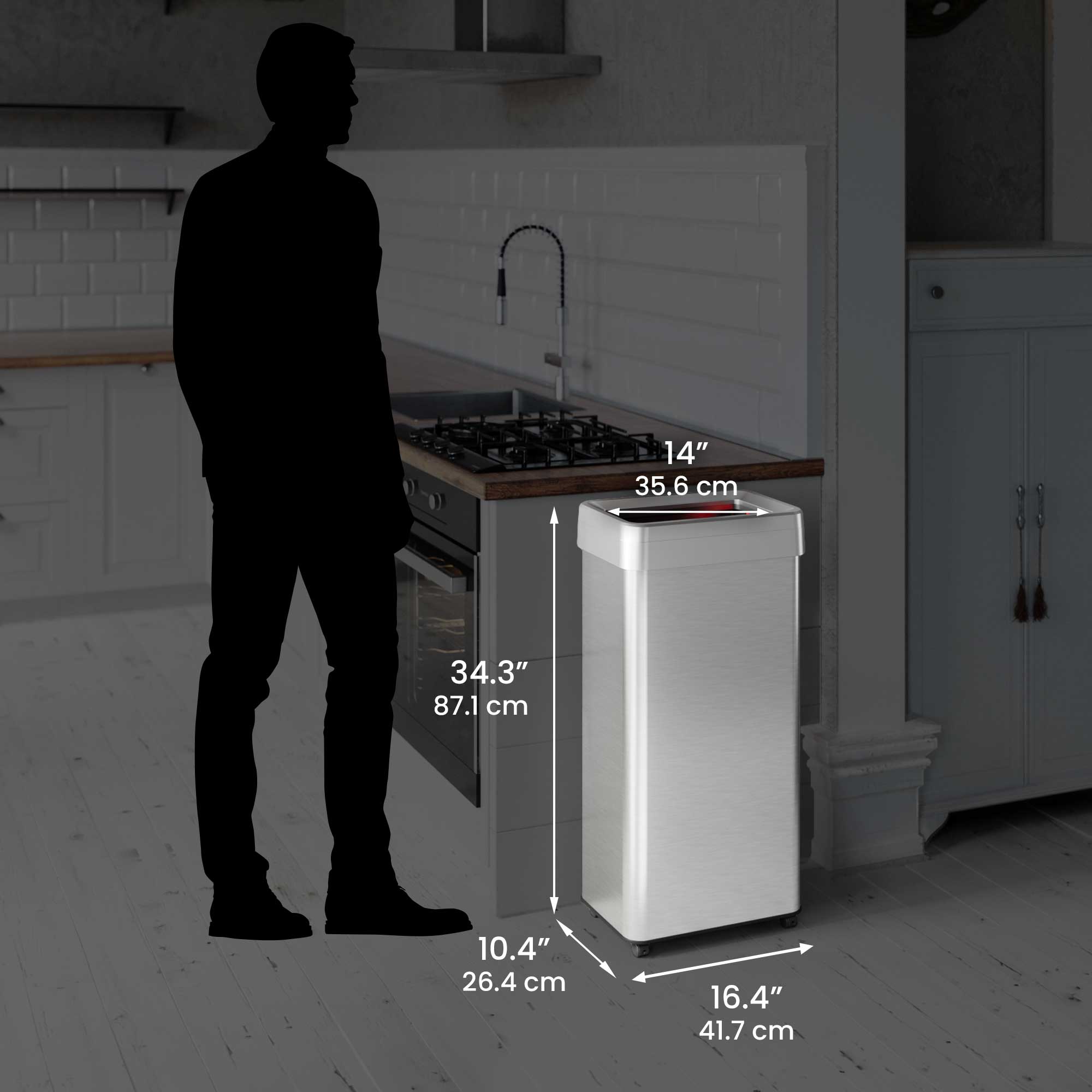 The iTouchlesss Dual-Deodorizer Open Top Trash Can is available in 16, 18, and 21 gallon sizes. The elegant, space-saving design fits into any décor.