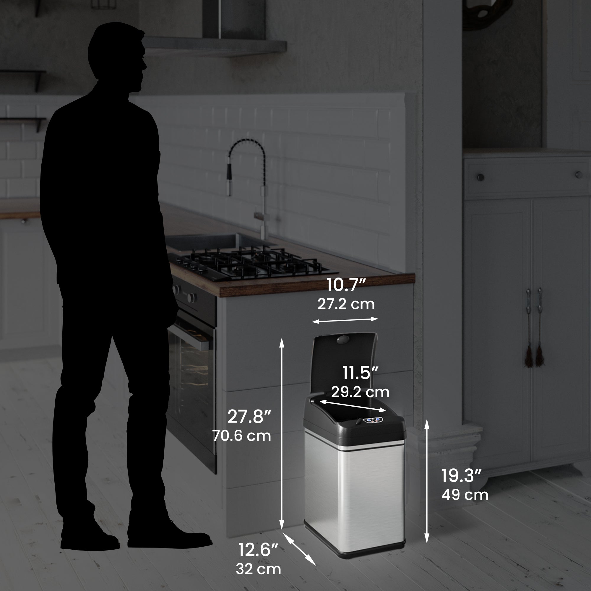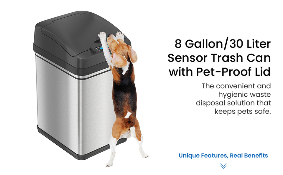 Upgrade your kitchen with an 8-gallon touchless trash can designed for convenience and hygiene. The stainless steel trash bin features a sensor-activated lid, keeping hands clean and eliminating cross-contamination. With a secure lid lock, it's the ultimate pet-proof garbage solution. Equipped with AbsorbX natural carbon odor filter, it neutralizes smells for a fresh environment.