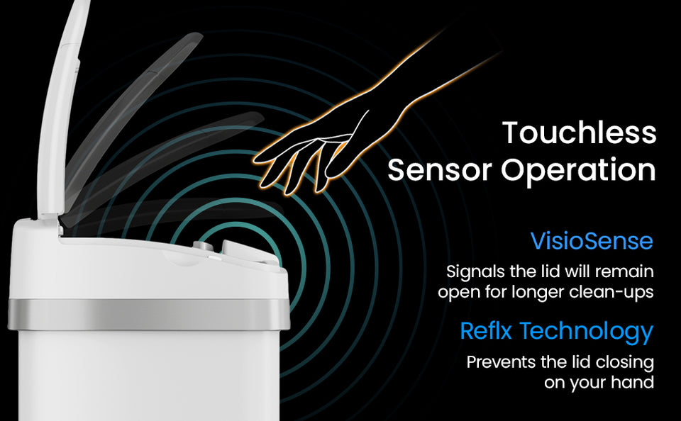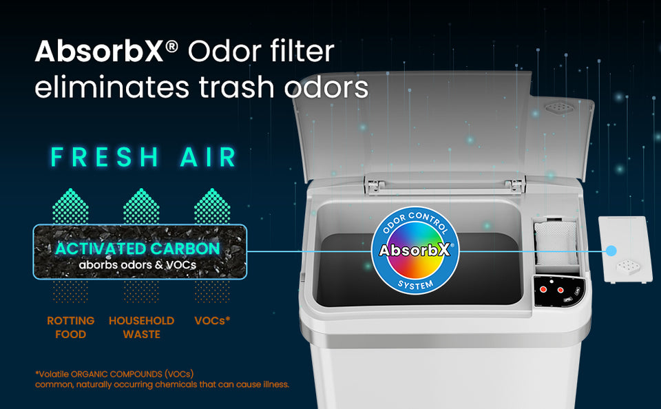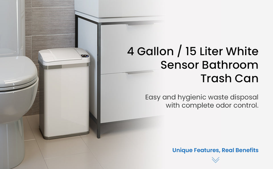 The 4 Gallon / 15 Liter White Stainless Steel Sensor Bathroom Trash Can combines sleek design with modern functionality. This touchless trash can is perfect for any bathroom, featuring a sensor-operated lid for a hands-free, hygienic experience. It also includes a complete odor control system with an AbsorbX Odor Filter and a refreshing Lemon Fragrance Cartridge to keep your space smelling fresh.