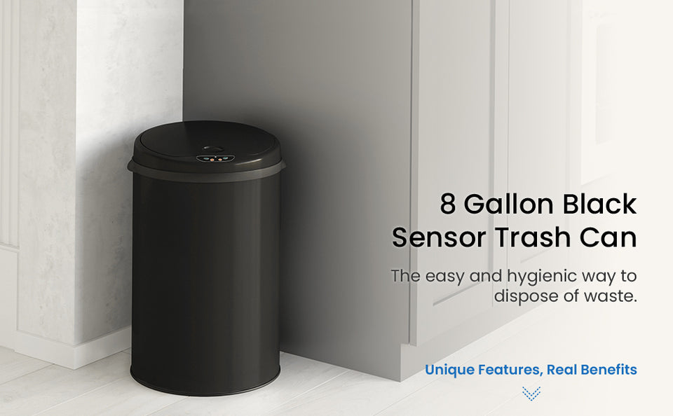 Upgrade your space with the 8 Gallon / 30 Liter Black Stainless Steel Sensor Trash Can, designed for both style and cleanliness. The advanced motion sensor lid opens automatically for a fully hands-free experience, keeping your kitchen or bathroom hygienic and convenient. With its elegant black stainless steel finish and built-in AbsorbX® Odor Control System, this automatic trash can helps maintain a fresh, modern environment every day.