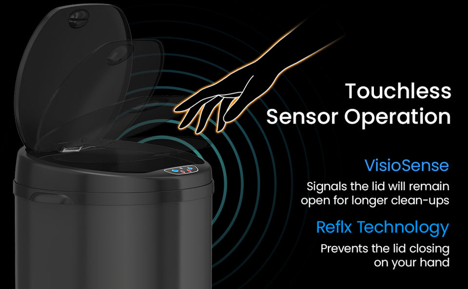 • Touchless Sensor Lid — Opens automatically with a wave of your hand, providing a hygienic, hands-free way to dispose of waste.