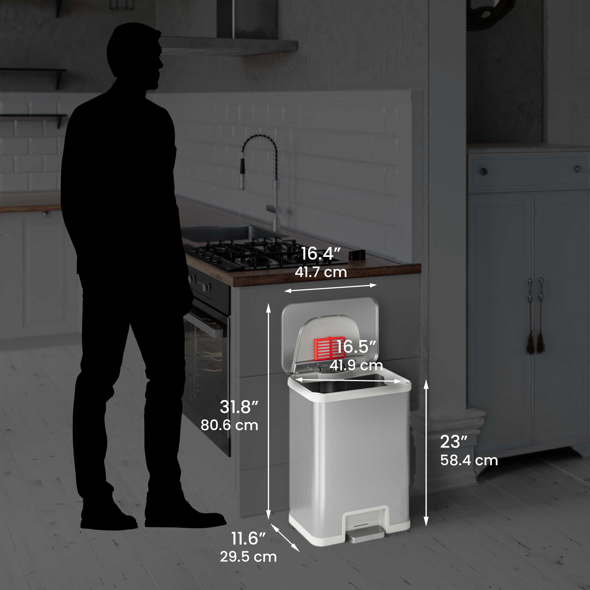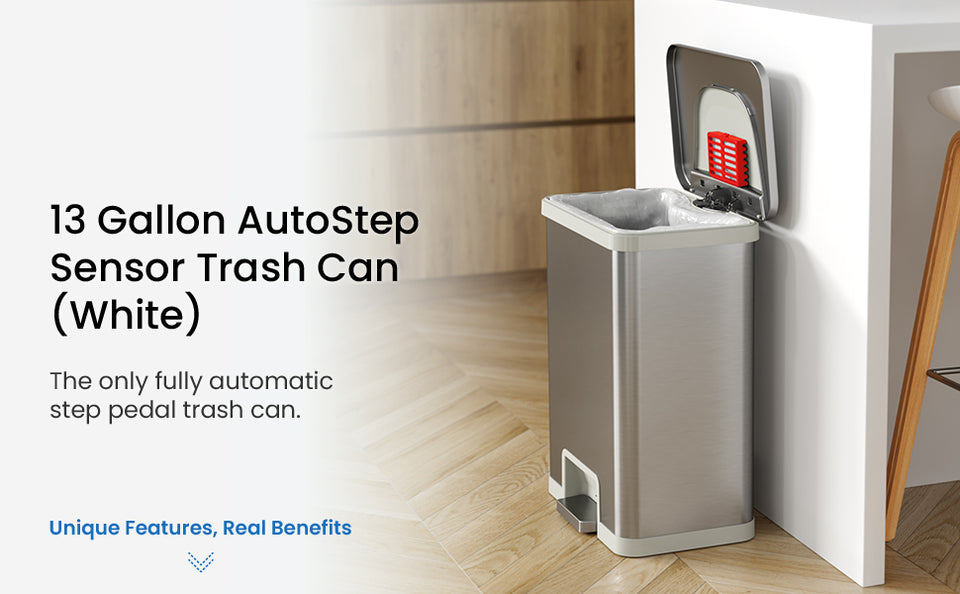 Upgrade your kitchen with the 50 Liter / 13 Gallon AutoStep Stainless Steel Pedal Sensor Kitchen Trash Can with White Trim — the perfect blend of innovation and elegance. A simple tap on the pedal activates the automatic lid for a completely touchless, hygienic experience. The sleek white trim adds a fresh, contemporary accent that brightens any kitchen décor, while the AbsorbX® natural carbon odor filter helps keep your space clean and odor-free. Designed with premium stainless steel and precision engineering, AutoStep delivers effortless convenience with every use.