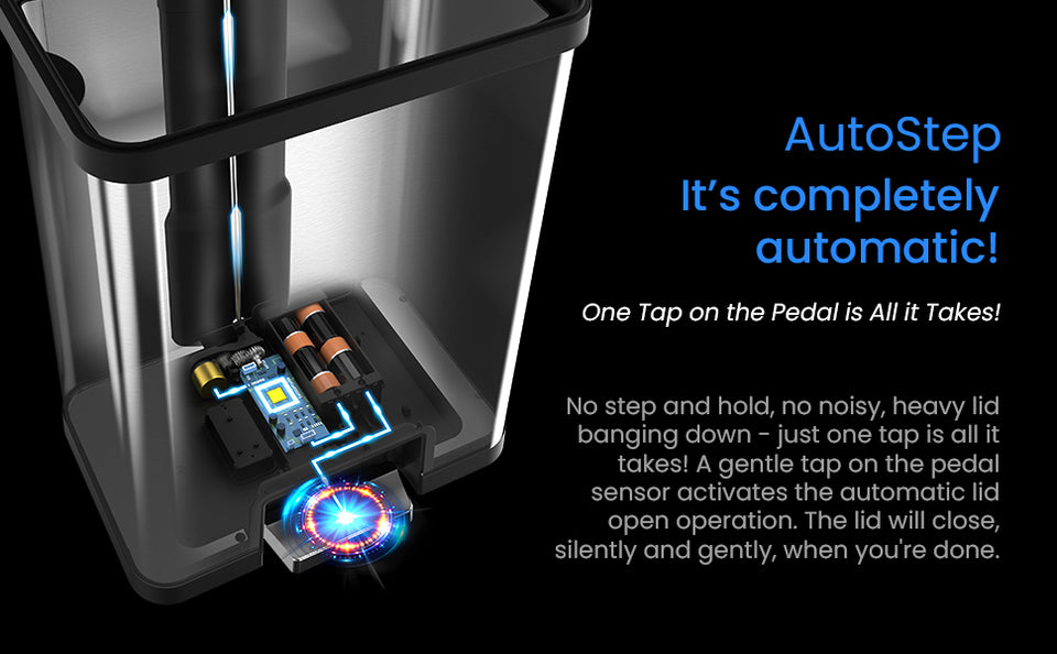 • Automatic Pedal Sensor — Lid opens instantly with a light tap, providing 100% hands-free convenience.