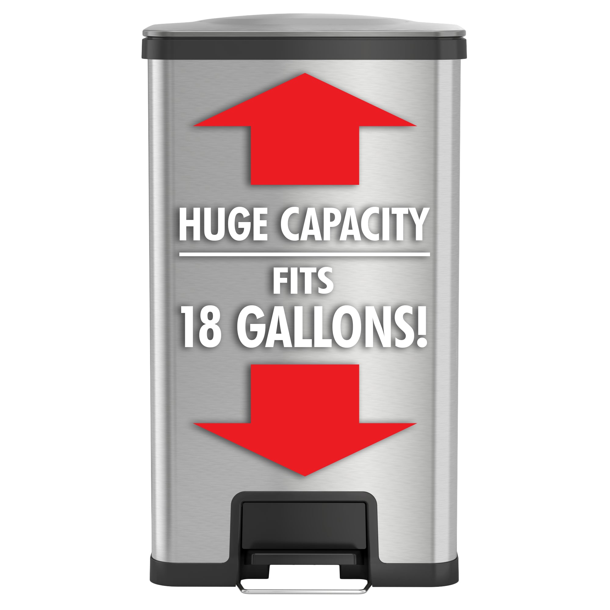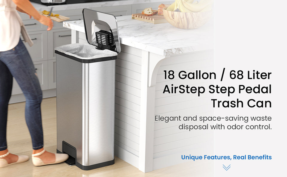 Upgrade your kitchen with the 18 Gallon / 68 Liter AirStep Stainless Steel Step Pedal Kitchen Trash Can — the perfect blend of capacity, performance, and style. Its innovative AirStep® pedal mechanism delivers a light, effortless feel with every press, while the soft-close lid ensures quiet operation. Built for busy homes and commercial environments alike, this extra-large stainless steel trash can includes an AbsorbX® natural carbon odor filter to keep your space fresh and odor-free.
