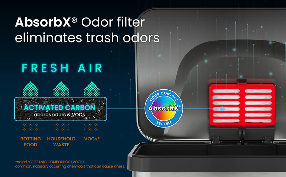 • AbsorbX® Odor Filter — Natural carbon filter neutralizes odors, maintaining a clean, fresh environment.