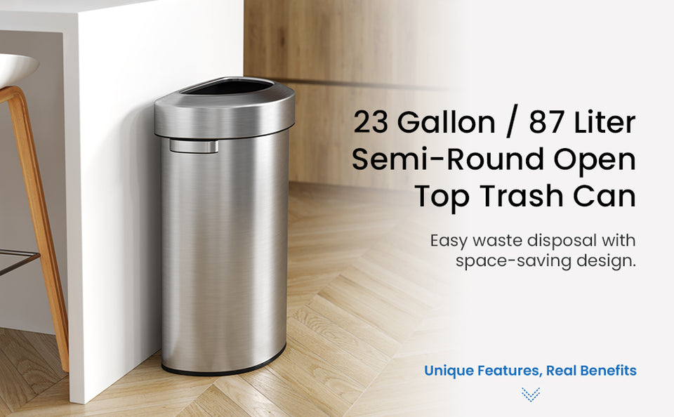 The 23 Gallon / 87 Liter Stainless Steel Semi-Round Open Top Trash Can is the perfect solution for high-traffic areas like kitchens, offices, and businesses. This extra-large capacity trash can is designed for quick and efficient trash disposal, offering a wide opening for easy access.