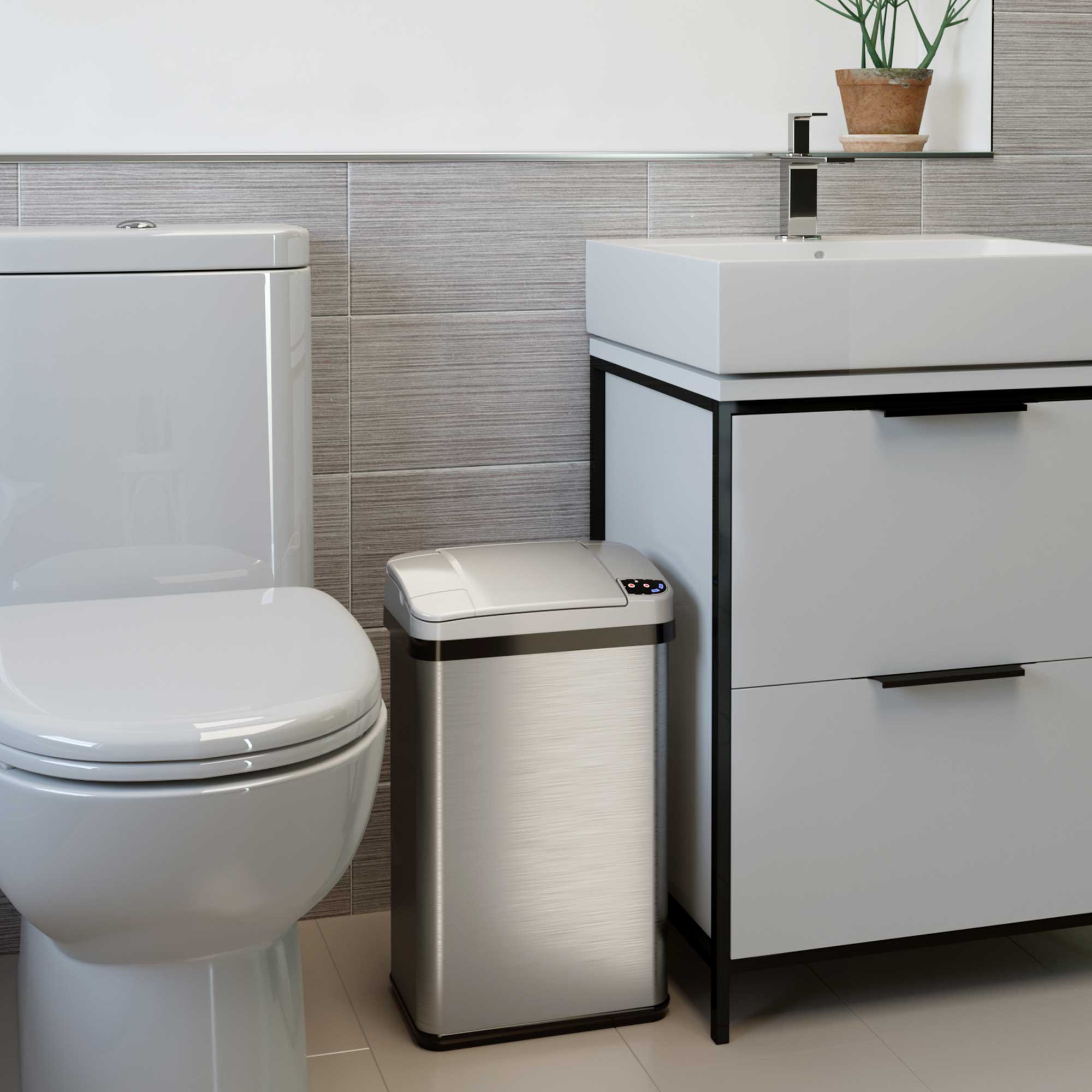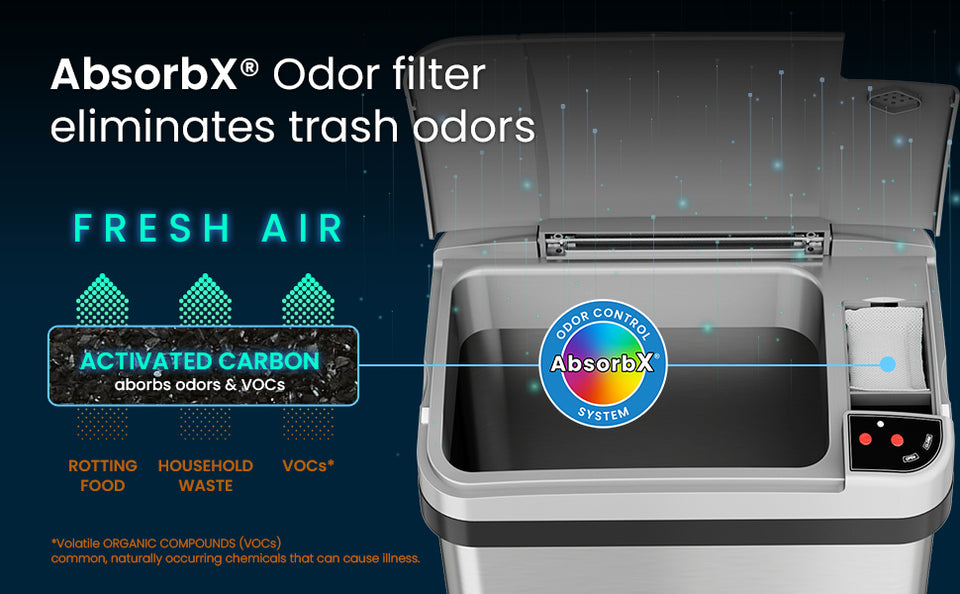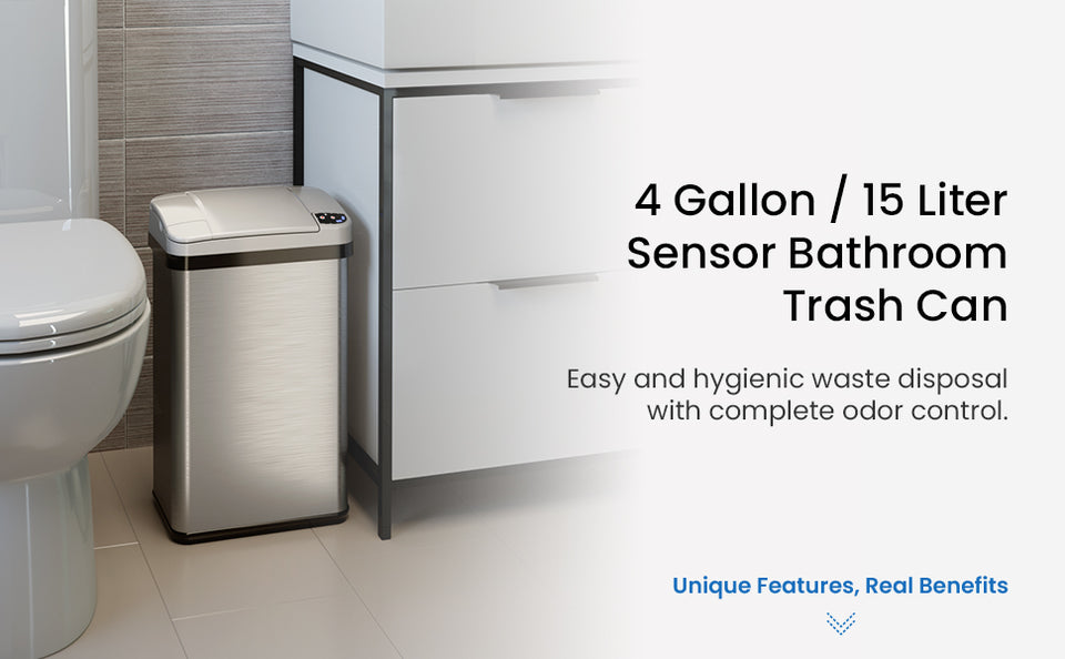 Upgrade your bathroom or office with the 15 Liter / 4 Gallon Stainless Steel Sensor Trash Can, combining touchless technology with sleek, modern design. This compact automatic trash can features a motion-activated sensor lid for hands-free convenience and enhanced hygiene. The built-in AbsorbX® Odor Filter and Lemon Fragrance Cartridge work together to eliminate odors and keep your space fresh and inviting.